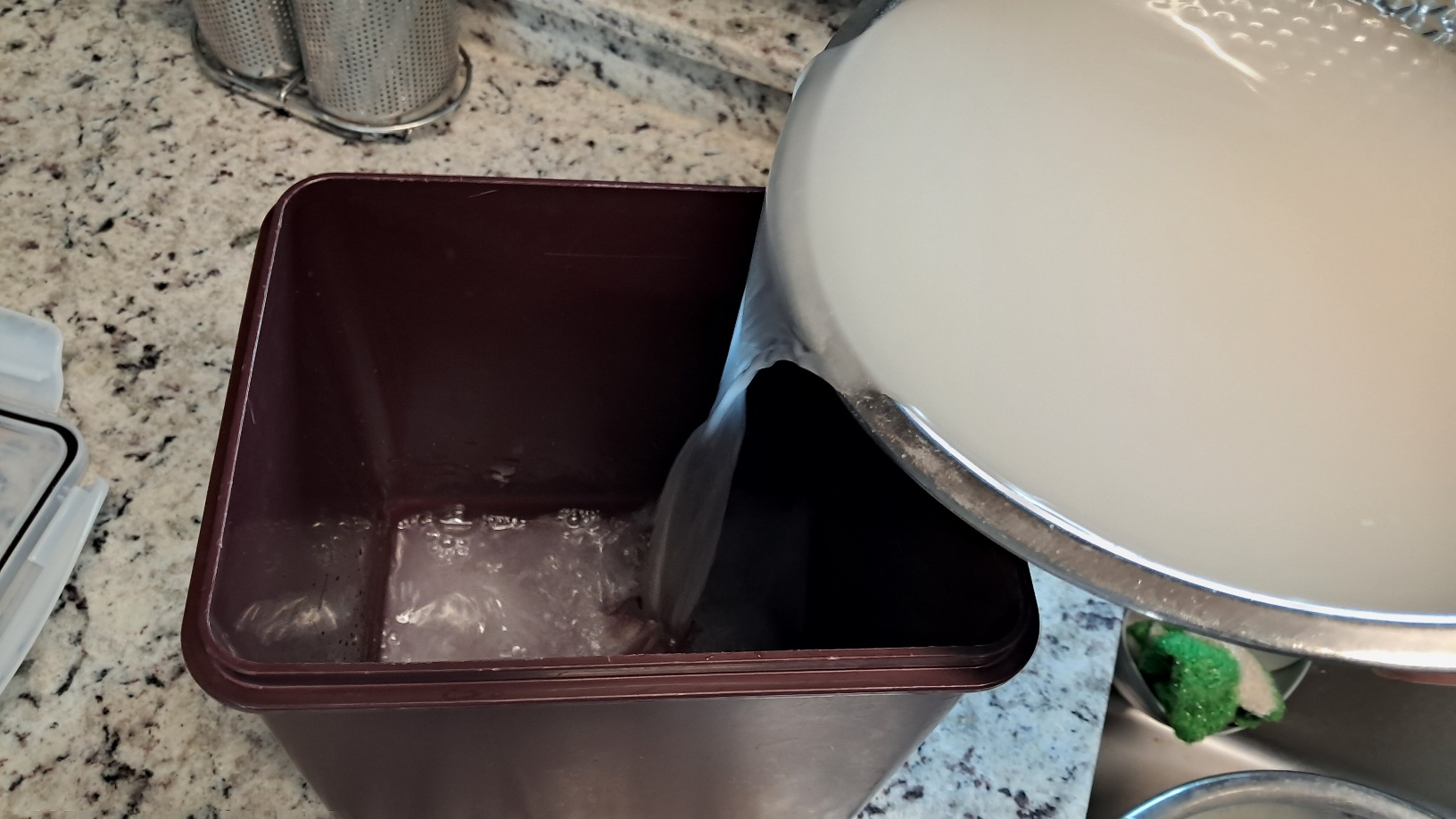 쌀을 잘 씻고 남은 쌀뜨물을 넣어줍니다. 여러번 씻어야 원하는 만큼의 양이 나오더라고요.