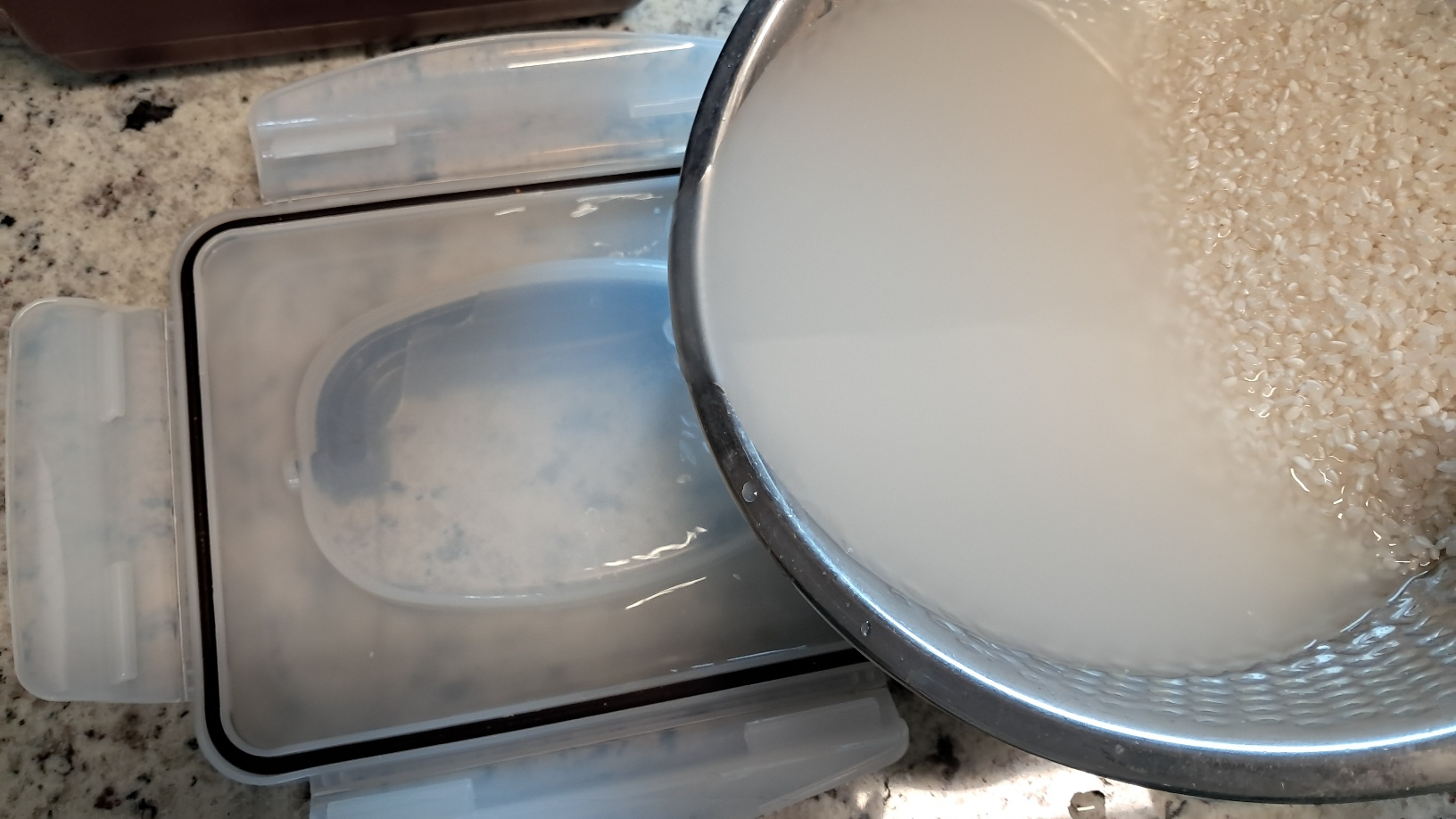 활용하는 방법은 간단해요. 쌀을 씻어서 나온 쌀뜨물을 김치통에 부어서 채워주면 됩니다. 저는 뚜껑에서도 김치냄새가 나서 뚜껑에도 살짝 부어줬습니다.