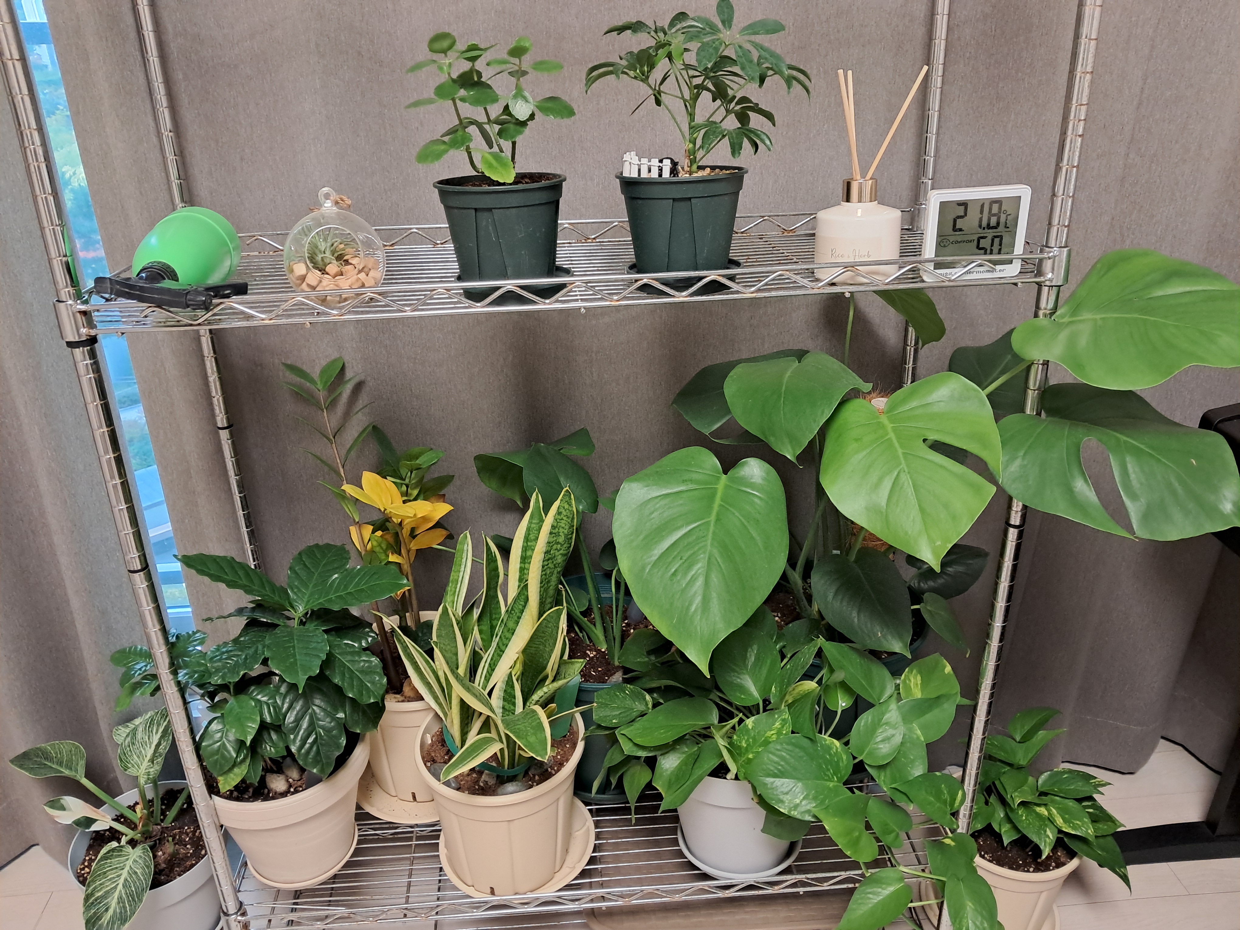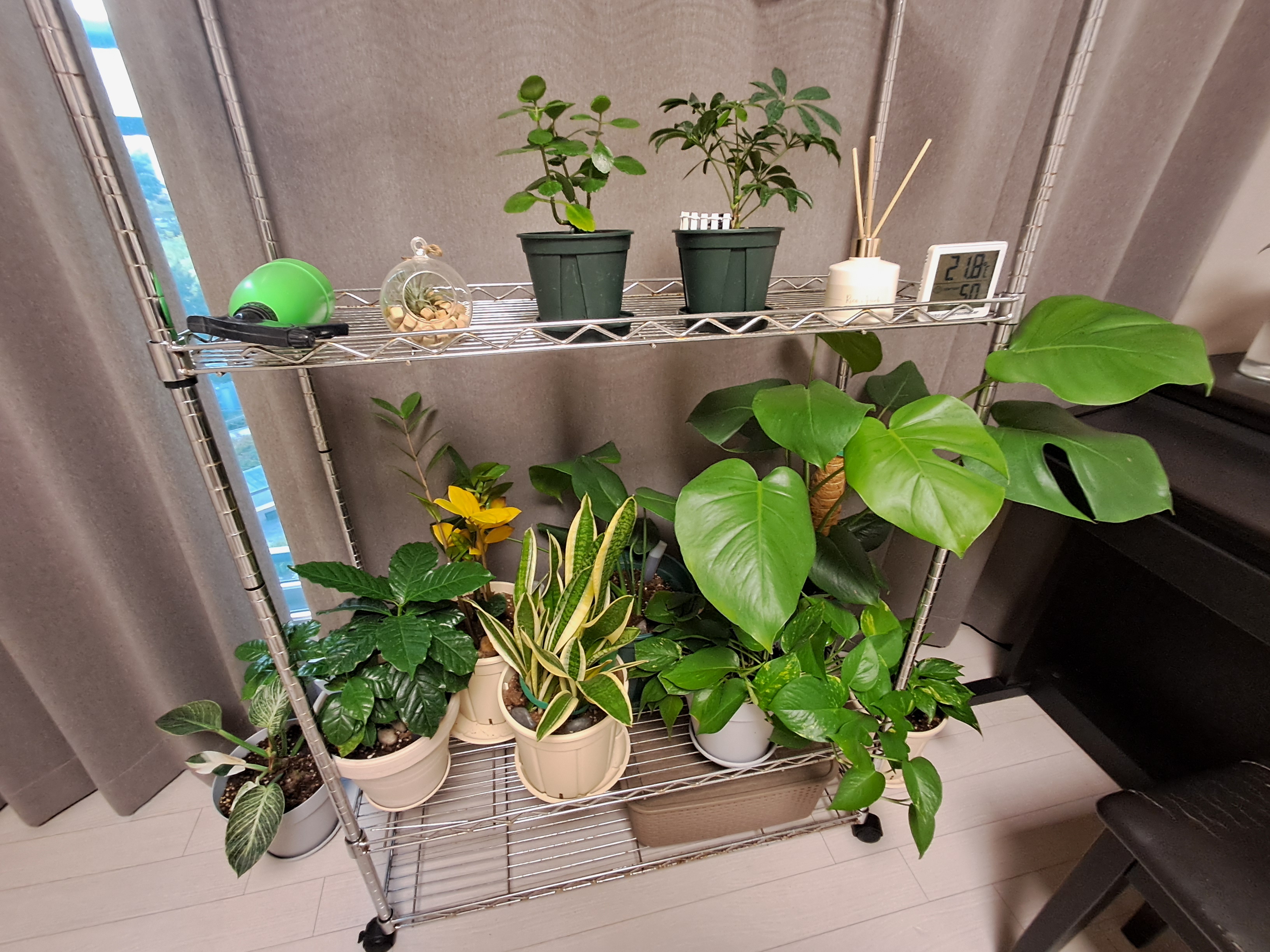 집에 있는 알루미늄? 정리대에 화분을 놓고 안방 작은 베란다에서 키우다가 날씨가 추워져서 작은방으로 들여놨어요.