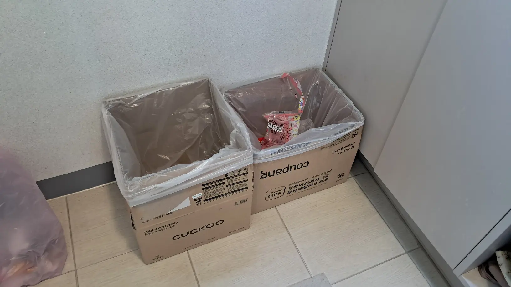 플라스틱 박스와 비닐 박스를 구분해 놓고, 나머지 분리수거 할 것들은 그때그때 나오는 박스나 비닐을 활용해서 버립니다.