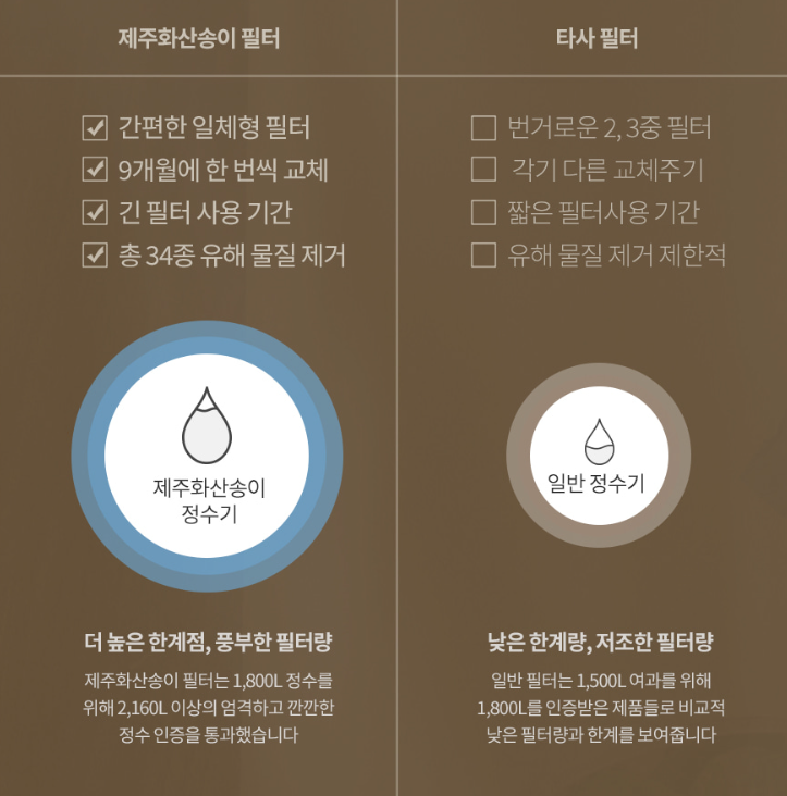 이 정수기는 화산송이 일체형 필터를 사용해서 깨끗하고 맛있는 물을 먹을 수 있고, 가격 또한 합리적이에요.