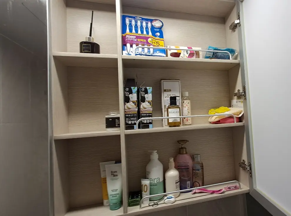 현재 사용하고 있는 샴푸나 바디클렌져 등을 제외하고는 모두 욕실 수납장에 보관하세요.