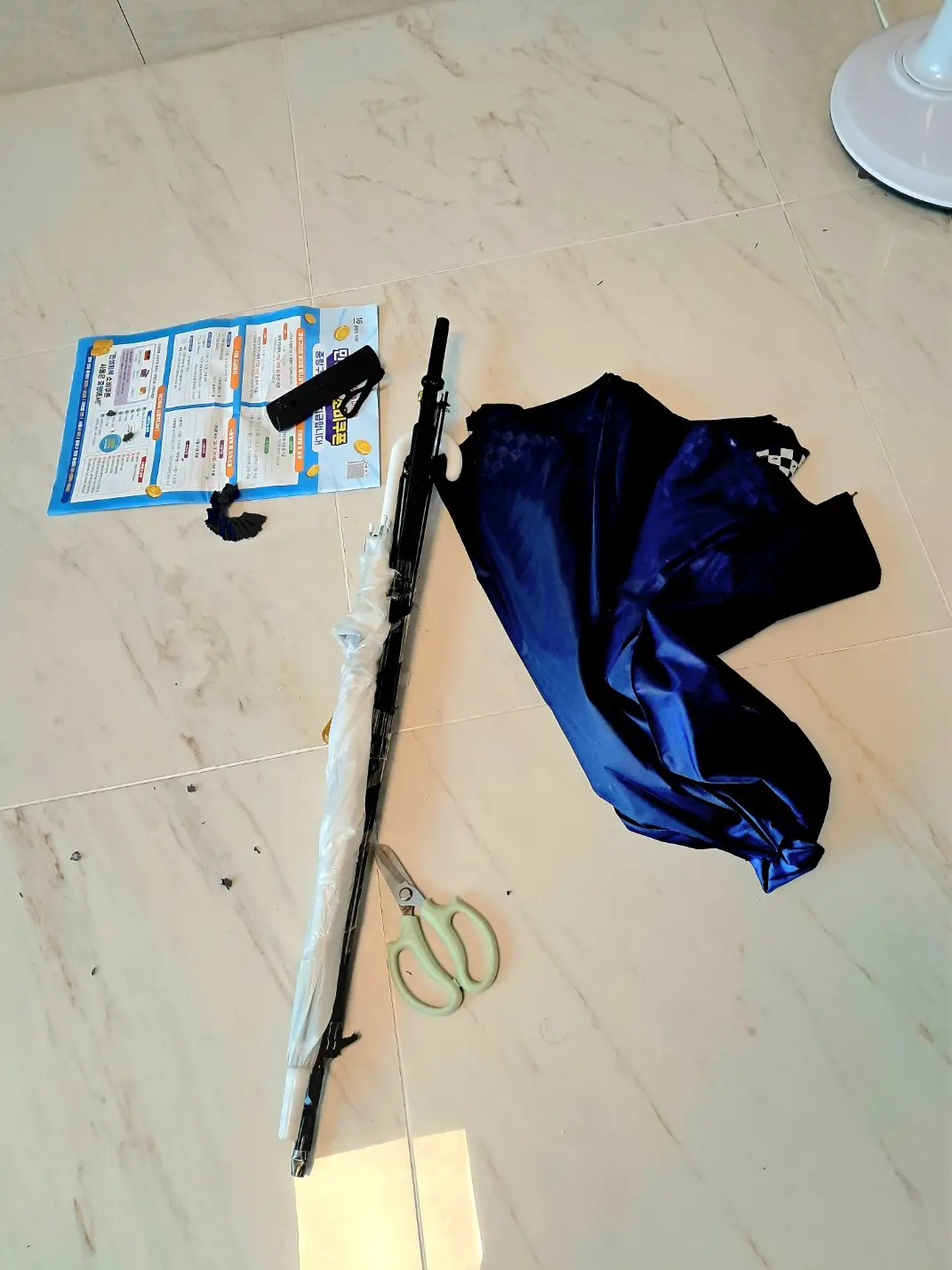 이제 우산 살과 우산천을 분리해줍니다. 우산살 끝의 캡을 땡겨서 풀고 나머지 연결된 실들은 가위로 잘라 줬습니다.
